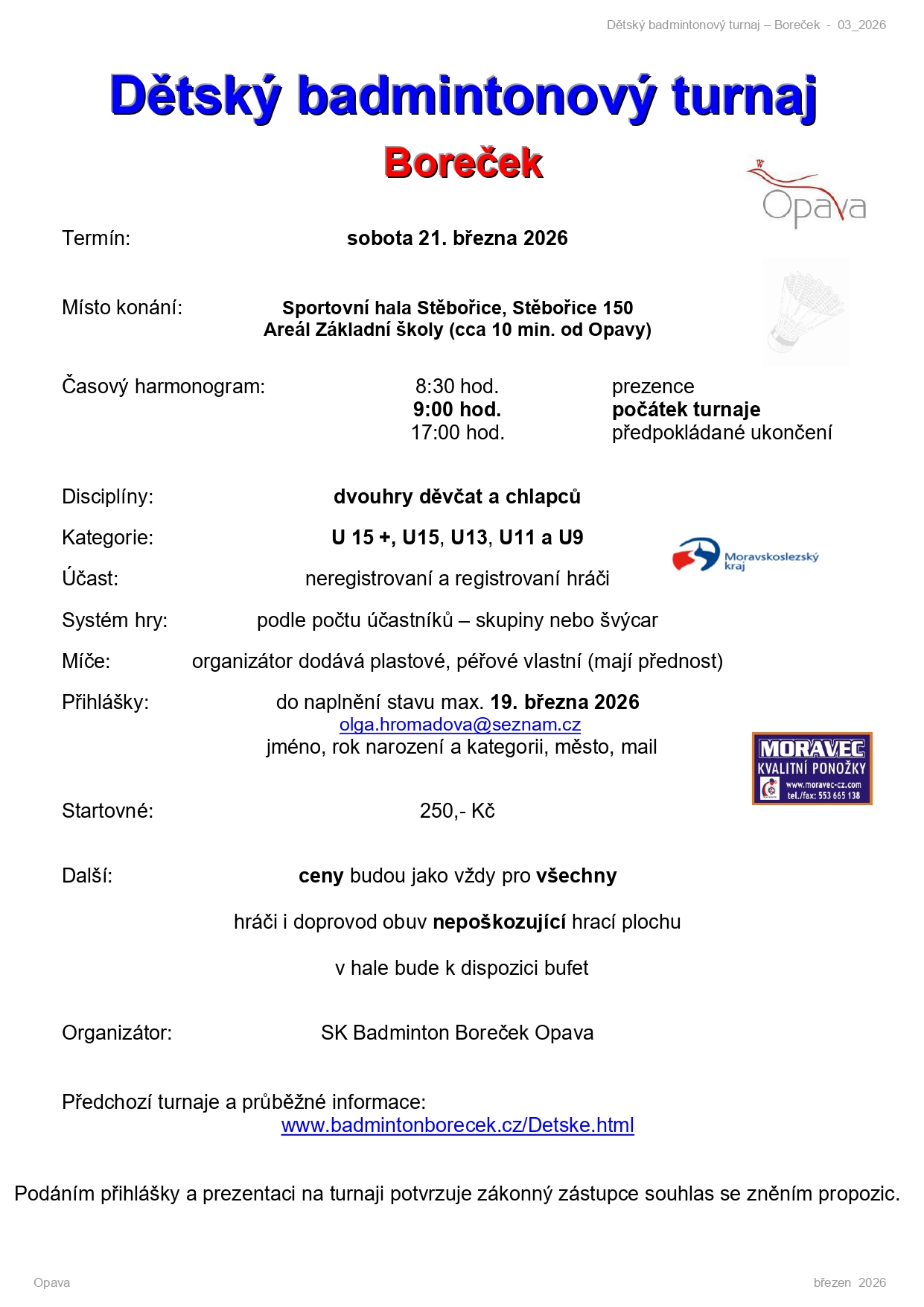 Propozice na dětský badmintonový turnaj – Opava, Boreček, 21.3.2026, U9, U11, U13, U15 a U15+ Autor David KožušníkZveřejněno dne23.2.2026 Propozice ve formátu PDF.
